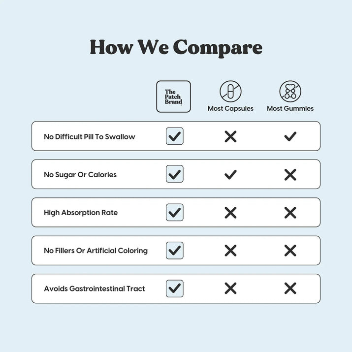 Answer 1: The patches deliver vitamins directly through your skin, allowing for nearly 100% nutrient absorption without the need for pills or sugar. Simply apply the patch to a clean, dry area of skin, and enjoy the benefits over the course of up to 8 hours.